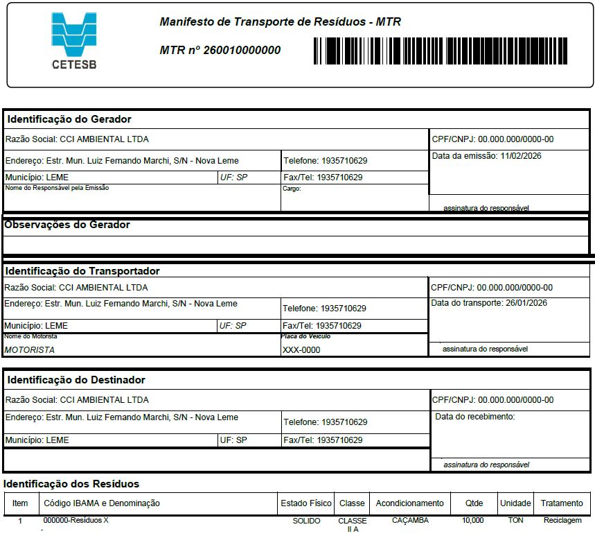 - Emissão de MTR (Manifesto de Transporte de Resíduos)